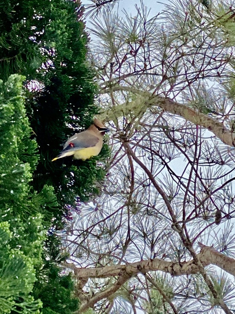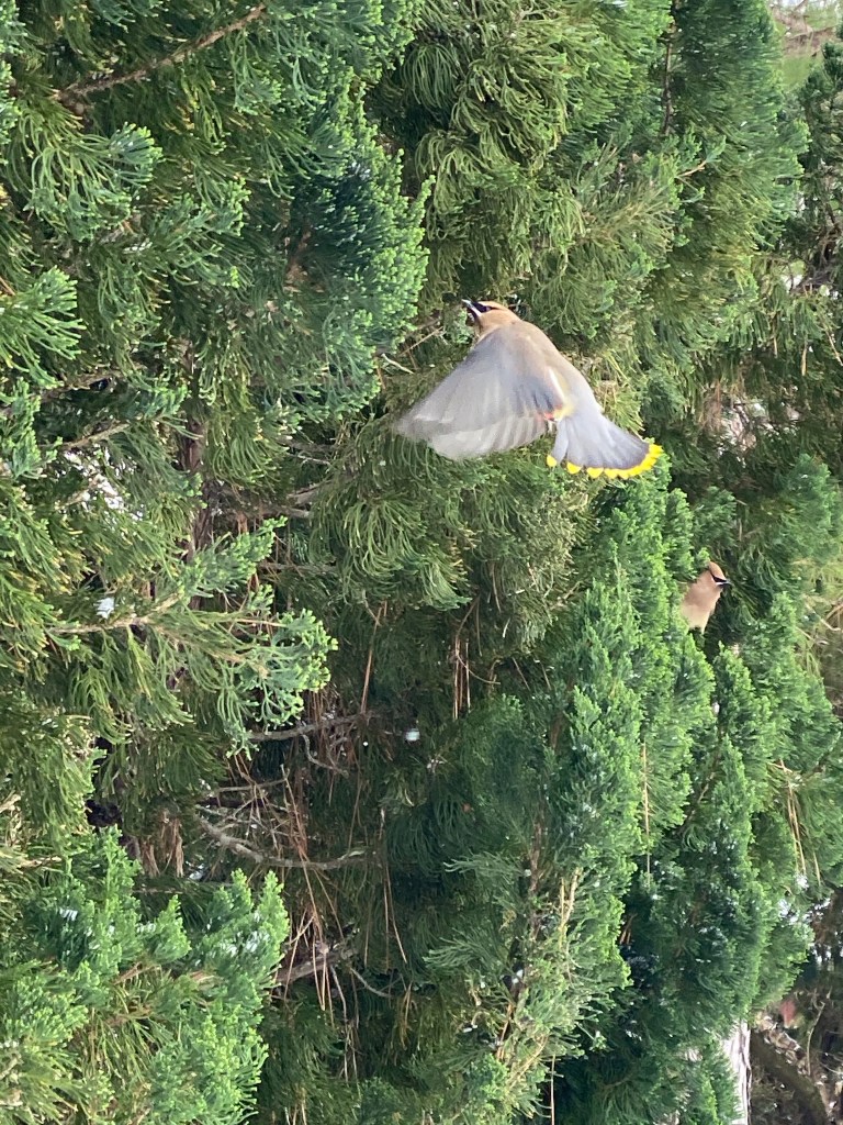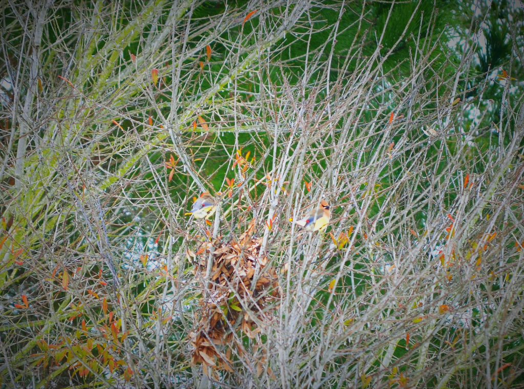 Near the end of the block, out of the blue, were three birds that looked like they came out of a rock concert. They had “mascara”, “Mohawks”, and they looked so colorful. The black eyeliner on the bird made it look elegant and exquisite, while the crest on its head looks wild and savage. The tint of the blue, yellow, and vibrant red looks like it popped out of Picasso’s art. It was called a Cedar Waxwing and they were probably the most angelic bird I’ve ever seen in my 13 years of life. I filmed them with shaky hands from awe and joy. After a few minutes of being awestruck, I ran to get a better quality camera, the Nikon camera, but when I came back they were gone. I came back home and my mom decided to go for another round of walking to see if I can capture a picture of the waxwings. Suddenly, I saw more Cedar Waxwings on a crystal, clear puddle on the concrete road drinking water. I took a picture with a push of a button, but the snow that surrounded the water and the birds reflected the light from the sun causing the picture to look white. They flew away after a quick sip and I watched them go to a tree on the opposite side of the street. I took a few pictures here and there and quickly crossed the road with my mom. Sadly, the birds flew away due to a threat of a potential predator(me and my mom). On the flip side, I did get some pretty great shots and saw these new funky birds.