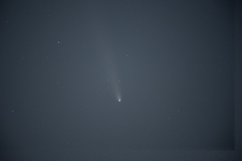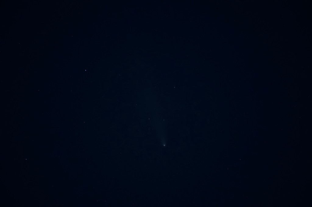 I reopened the stargazing app on my phone and tried to pinpoint where the comet would be. By now, the sun had set, and the parking lot lights disturbed the camera’s ISO, so I took a little walk to the darkest spot within my vicinity and set my camera shooting at a random star, thinking it was the comet. My dad also walked with our EV telescope (this will help later on) and tried slewing it to Vega, a bright star- to verify how accurate the telescope’s collimation is. Once he slewed it, he set the coordinates to the comet and started slewing nowhere near where I thought it would be. And in the telescope, it looked like a beam from a flashlight. I sat right next to the telescope to scope out the general area I needed to aim my camera at, and I jogged over to my camera and pressed the shutter button for some quick photos. I pressed the playback feature on my Nikon and saw nothing but stars. I moved to a different part of the sky, a bit higher up, and snapped another shot. In the image was a glimpse of a blue fireball, just shy of the top half of the picture. While grinning, I raised my camera, and the comet was centered. I had my ISO set to 2000 with a 1-second shutter speed.